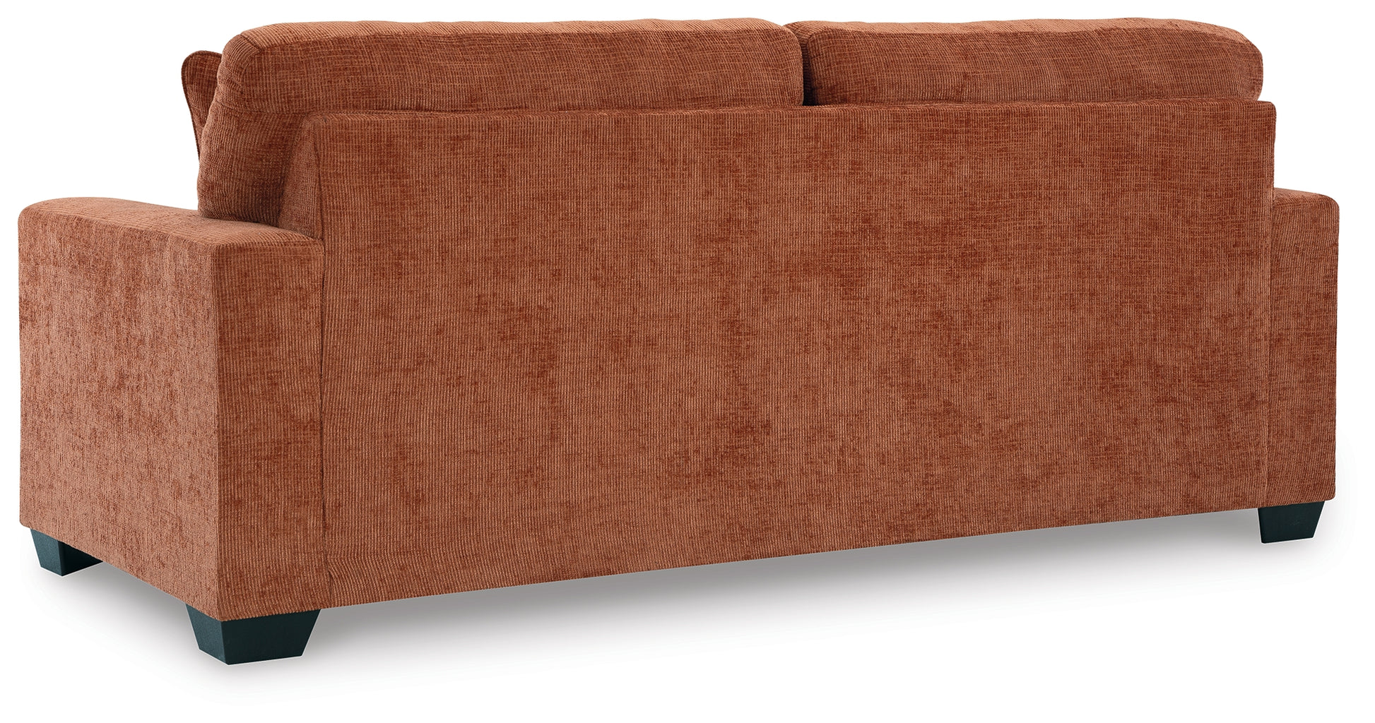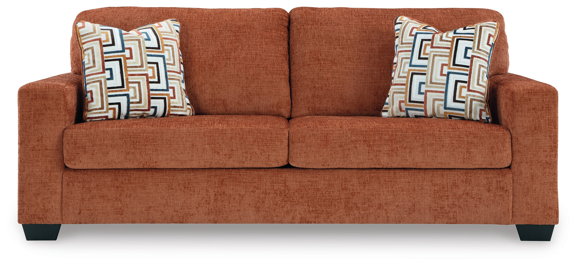 Looking to make a bold statement with color? Liven up your living room with this queen sofa sleeper. Its trend-right burnt orange upholstery adds a playful pop of color to your decor. Bold and eclectic accent pillows complete the look. Pairing posh style with everyday comfort, this piece is a welcome addition to contemporary spaces. And the queen memory foam pull-out mattress comfortably accommodates overnight guests.