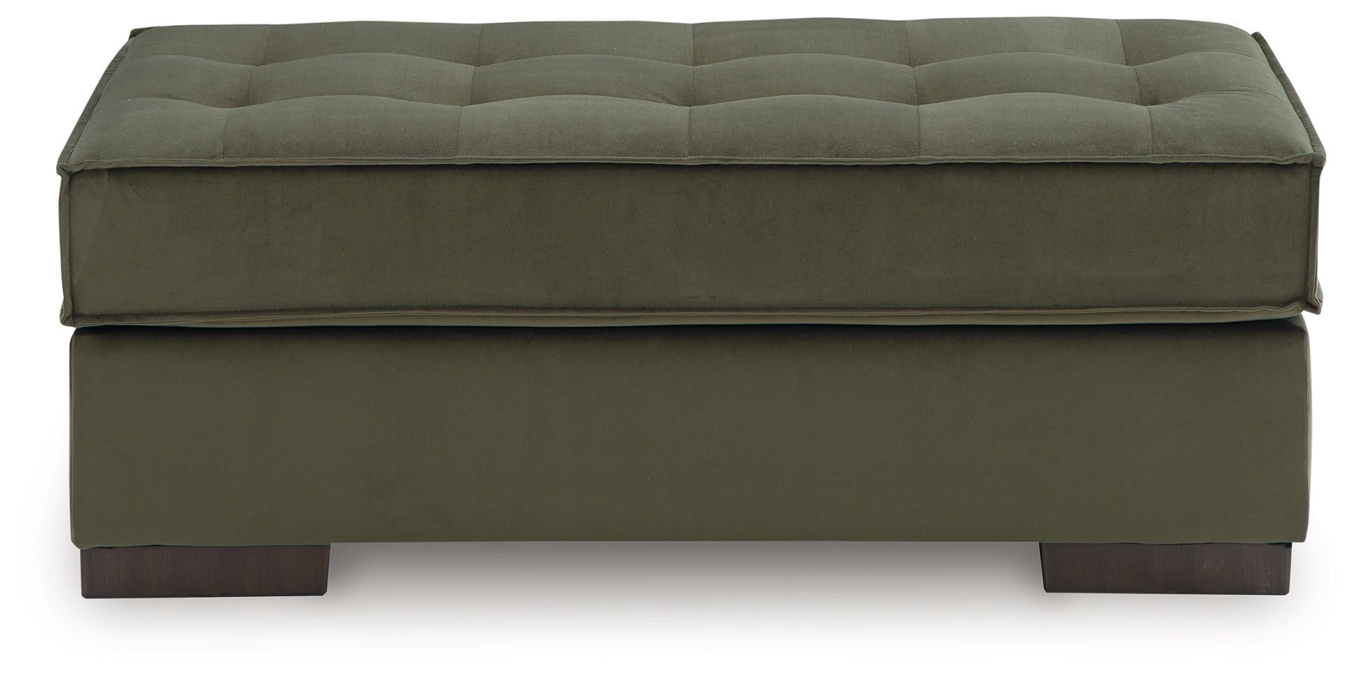 This sleek oversized accent ottoman offers a highly contemporary look with plenty of space to spread out. Dramatic tufted detailing and luxurious upholstery in a rich olive color create a sophisticated atmosphere. This ottoman is perfect for those who love to entertain, or simply relax, in uptown style and comfort.
