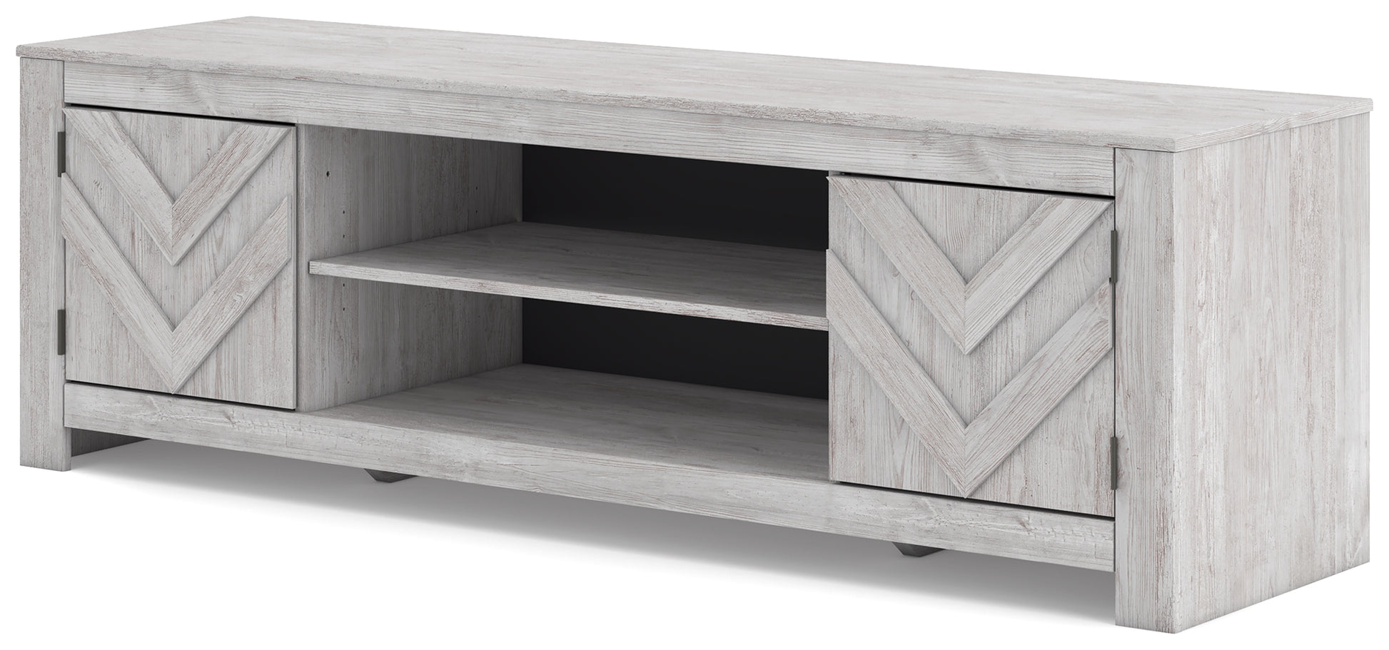 This TV stand embraces a classically charming aesthetic and repurposes it for modern living. Its light replicated wood grain appeals to your love of vintage character, while the chic chevron pattern is effortlessly on trend. And with hidden storage behind the doors, your media accessories stay tucked away in style.