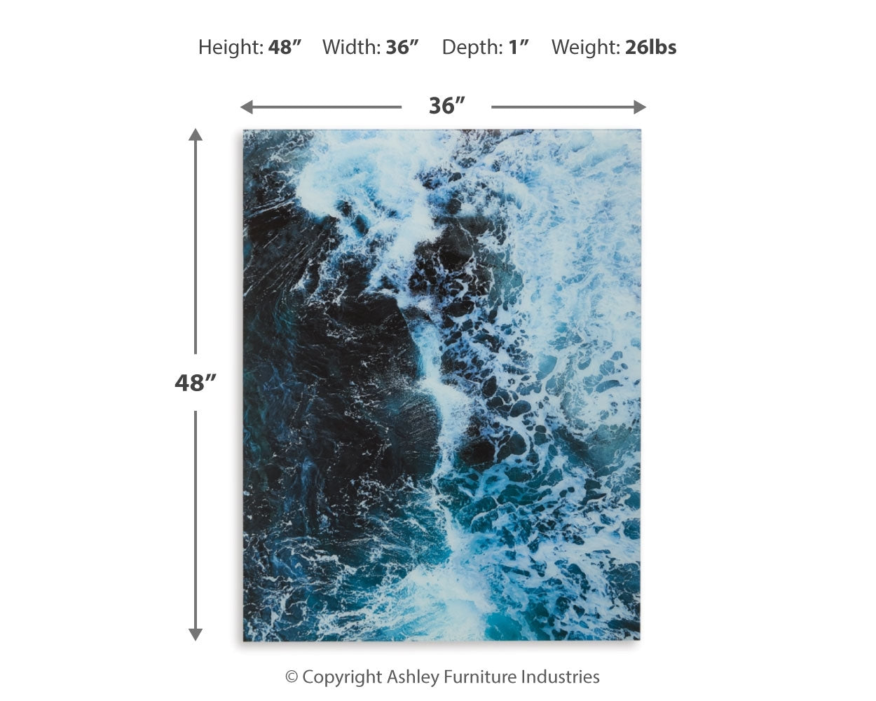 Like waves kissing the shoreline as they crash, this print on glass reminds you of the tide pulling out to sea. Swirling turquoise hues form a mesmerizing image of the ocean with foamy white caps. Perfect for ocean lovers or coastal cottages, this maritime art is sure to make a statement.