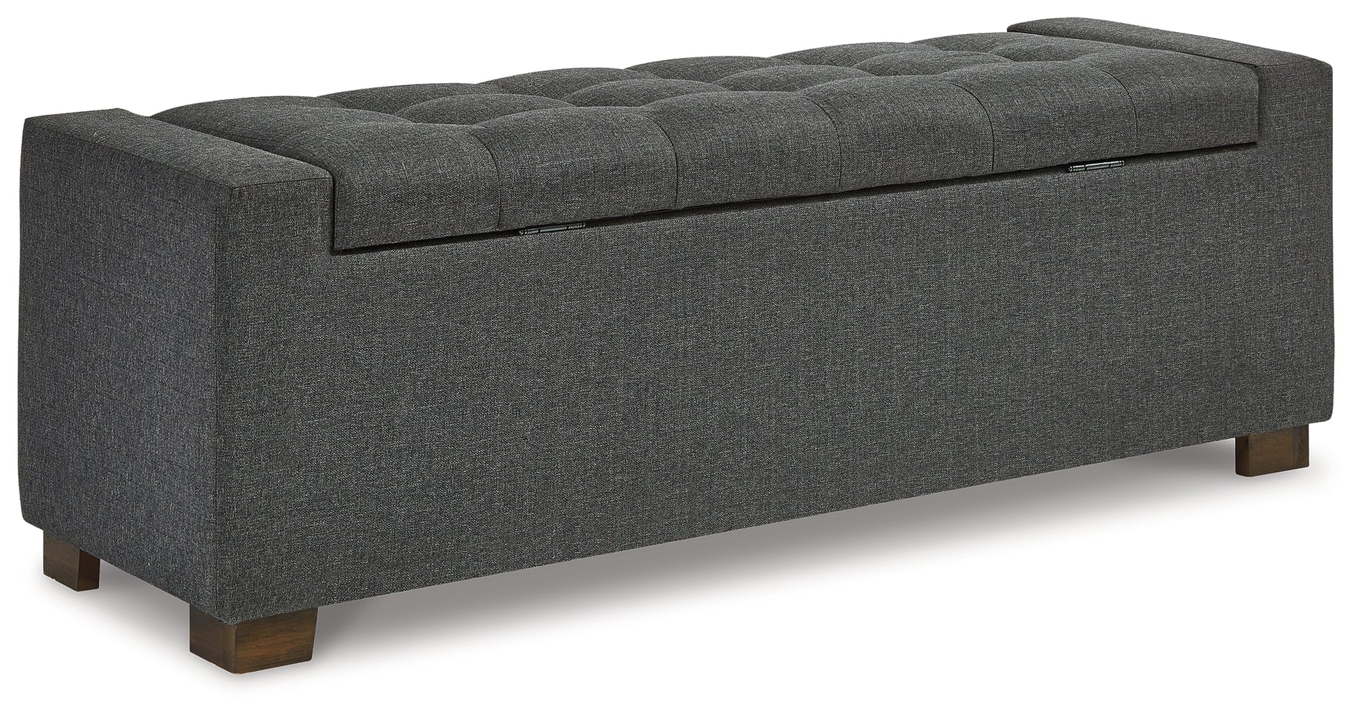 Whether gracing a front entry or living room, or placed at the foot of the bed, this upholstered storage bench is loaded with flair. A tufted cushioned seat with hinge reveals an ample storage compartment for this, that and the other. And the gorgeous gray fabric is the epitome of neutral sophistication.