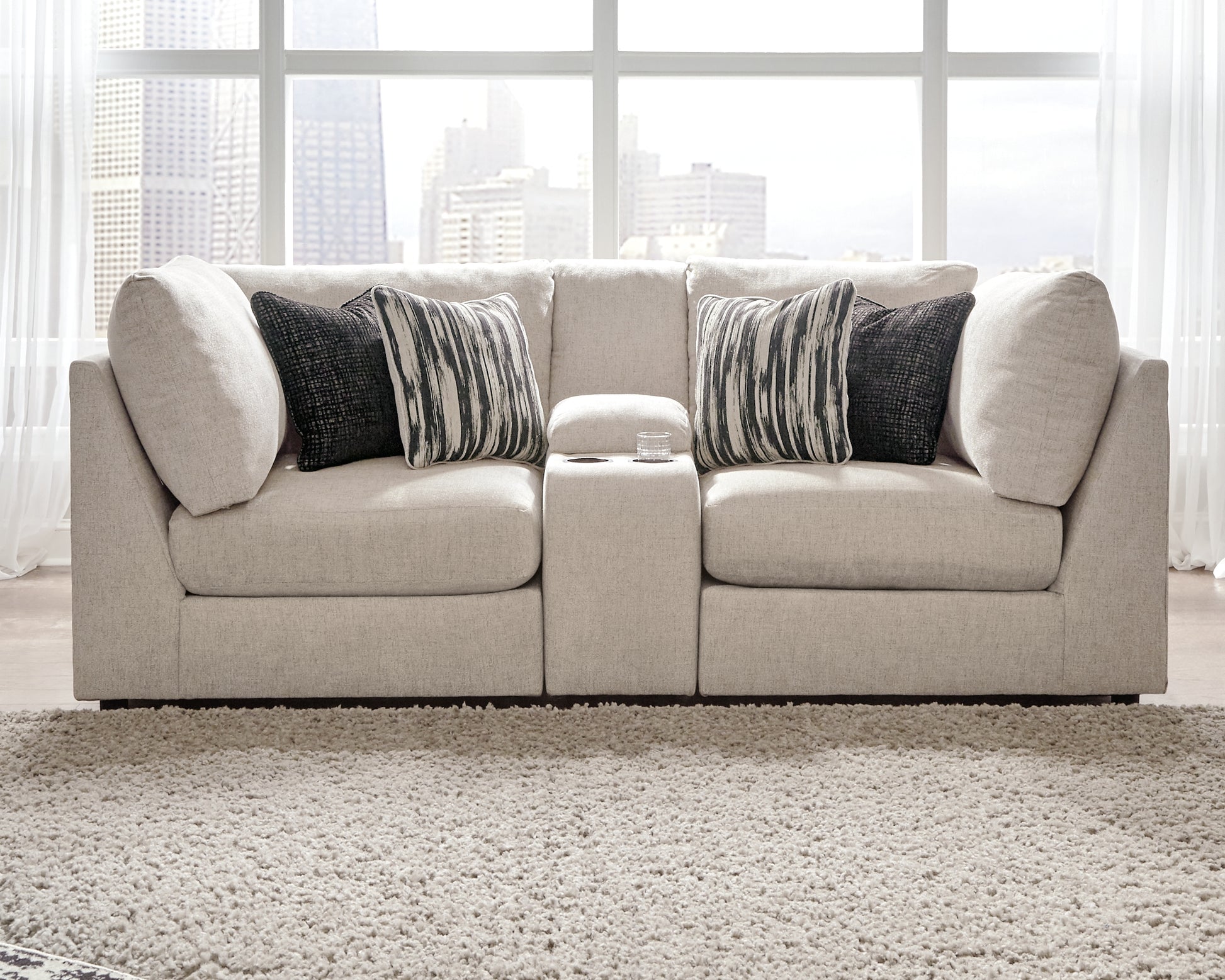 With its casual-contemporary aesthetic and modular design, this sectional makes way for high style and indulgent comfort. Rest assured, the thickly cushioned storage console includes not only a pair of cup holders, but also a USB port to keep you powered up while you unplug. Plush-to-the-touch chenille-feel upholstery in bisque beige is pure delight.
