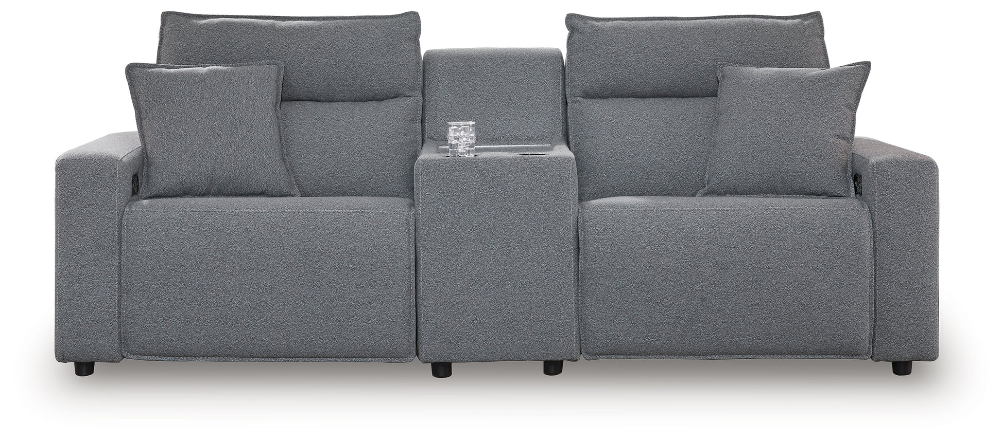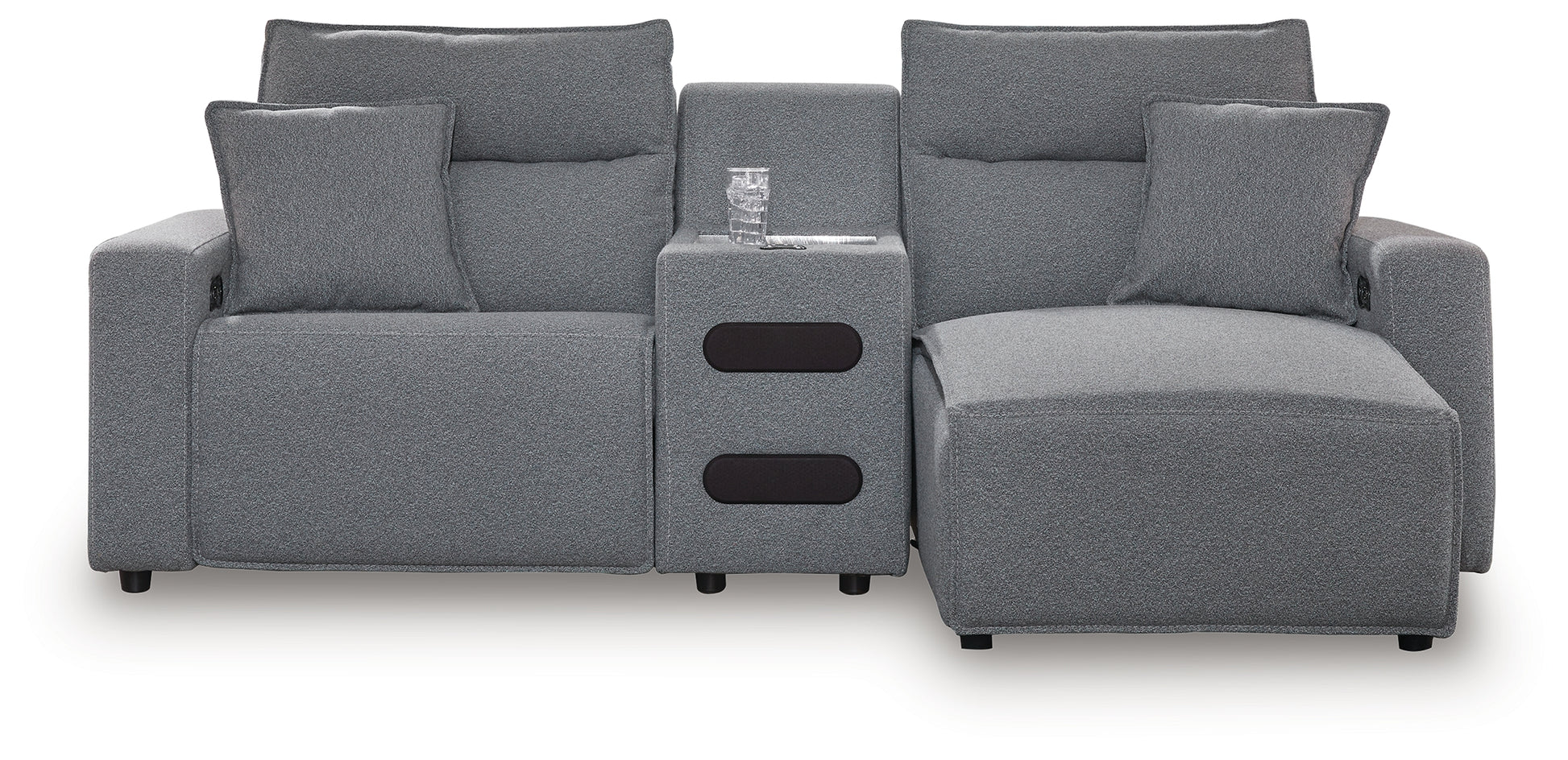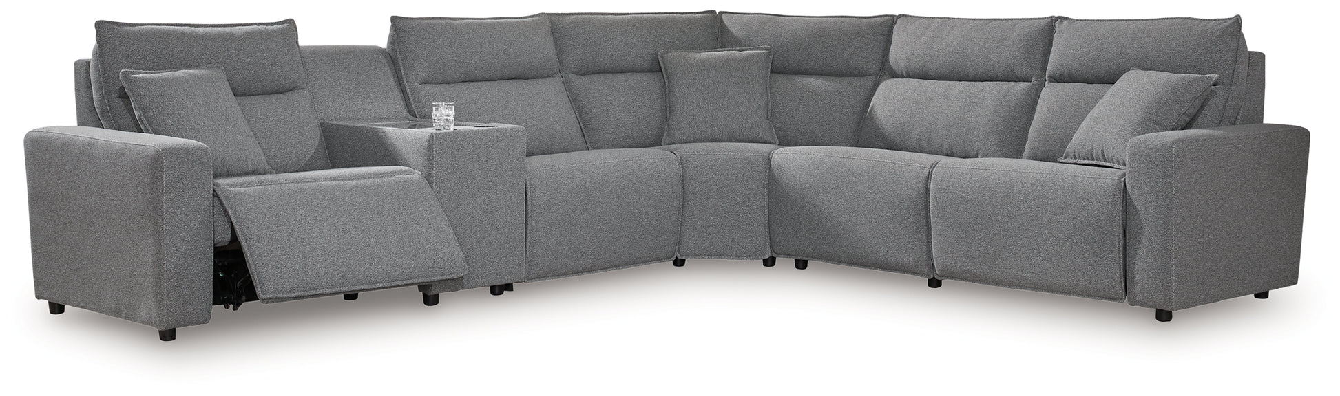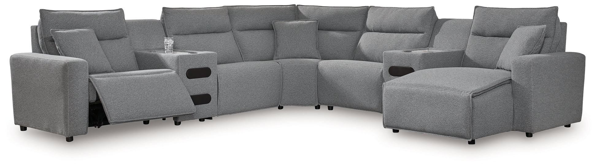 - Includes 6 modular pieces: left-arm facing power reclining back chaise, power armless recliner, armless chair, console with audio system, wedge and right-arm facing power recliner
