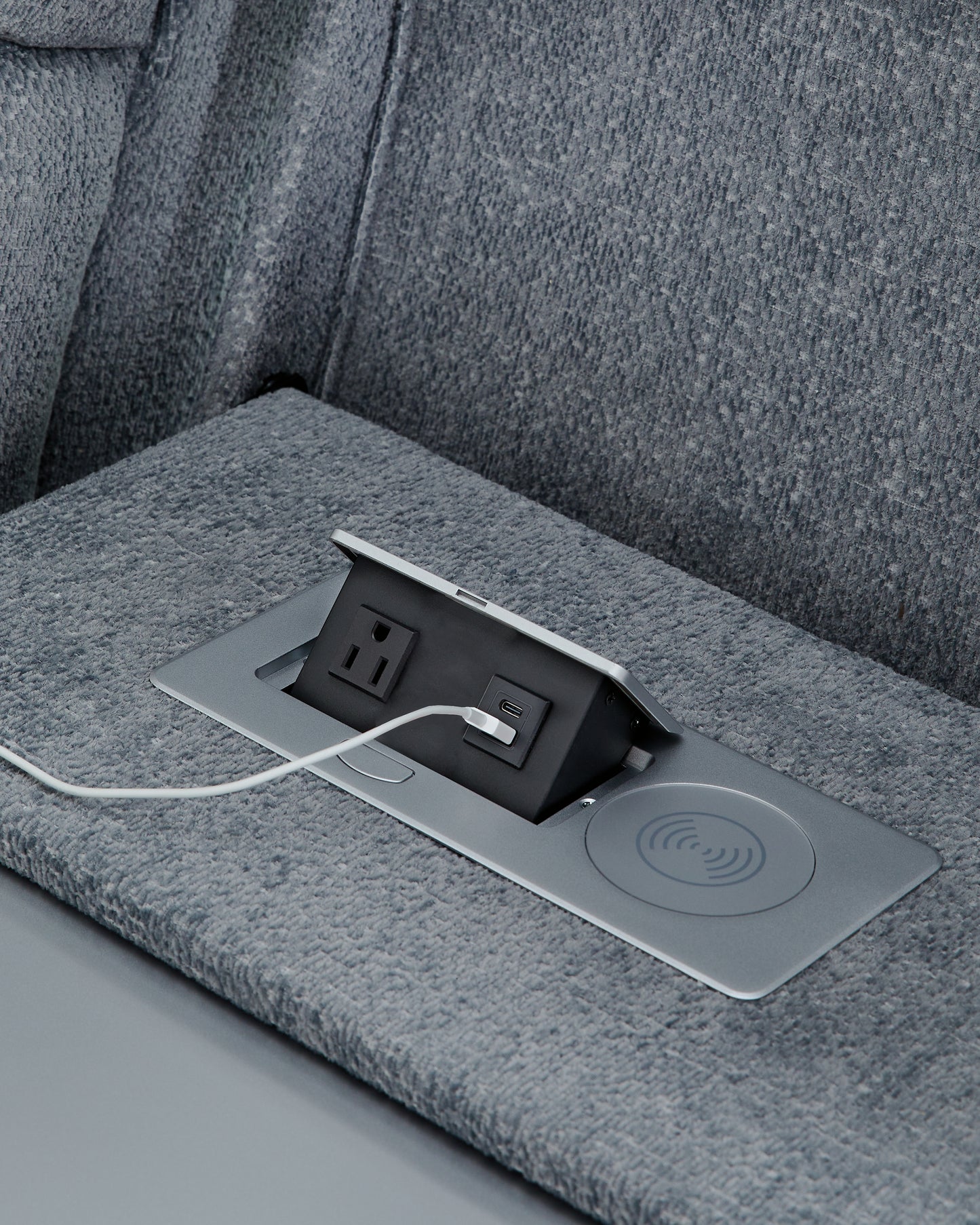 Chill-out time has never looked better. This power recliner's adjustable headrest ensures a perfect view of the TV no matter how far back you recline, while the extended ottoman takes your comfort to the next level. Handy charging features and storage cutouts put phones and e-readers at your fingertips. Plush yet practical Next-Gen Nuvella™ performance fabric and ambient lighting complete the theater-style experience. It's time to relax, nap or binge-watch in the best seat in the house.