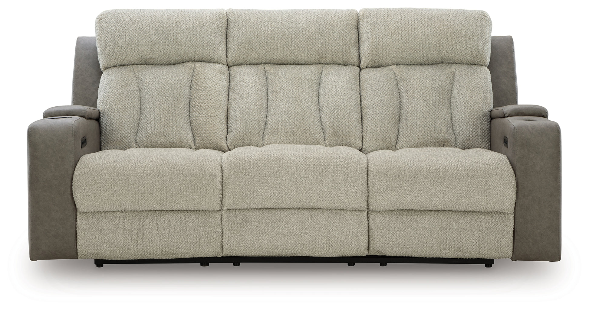 Refined relaxation, reimagined for the modern home. This power reclining sofa combines premium comfort with smart features like built-in storage arms, wireless charging and a drop-down table. One-touch reclining and adjustable headrests let you find your perfect position, while luxurious heat and massage functions melt away the day's stress. And for an added dose of style, it's wrapped in a two-tone upholstery that pairs soft textured fabric with coordinating faux leather.